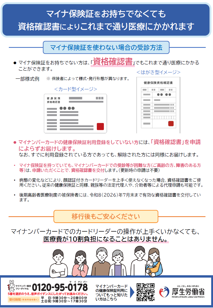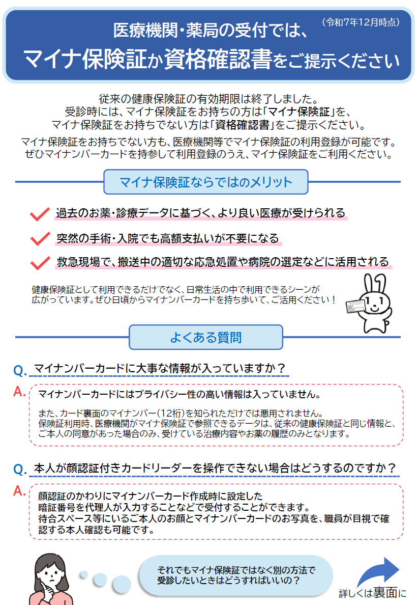 令和7年12月2日以降は、医療機関・薬局の受付では、マイナ保険証をお持ちの方は「マイナ保険証」を、マイナ保険証をお持ちでない方は「資格確認書」をご提示頂くことになります。