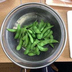 枝豆は600Wで1分30秒加熱しさやから身を取り出す。