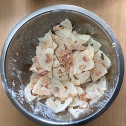 ①に浸る程度の水、酢を加えラップをし600Wで4分加熱する。水気を切り粗熱をとる。
