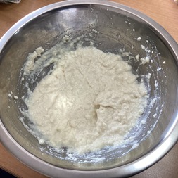 卵を加えてさらに混ぜ、片栗粉も加えて混ぜる。