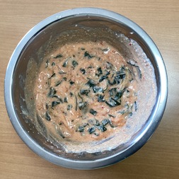 ②に①、キムチ、鶏ガラスープの素を加えてよく混ぜて、生地を作る。