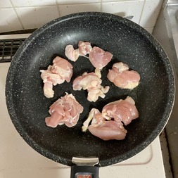 フライパンにオリーブオイルを入れ、鶏肉を軽く火が通るまで中火で3分程焼く。