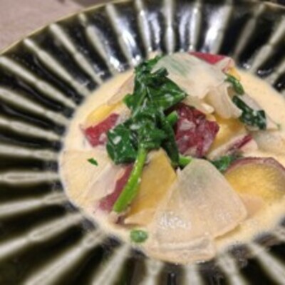 牛乳、おろしニンニクを加え軽く煮込み、塩、ほうれん草を加えさらに煮込み、味見をして塩で調整して完成
