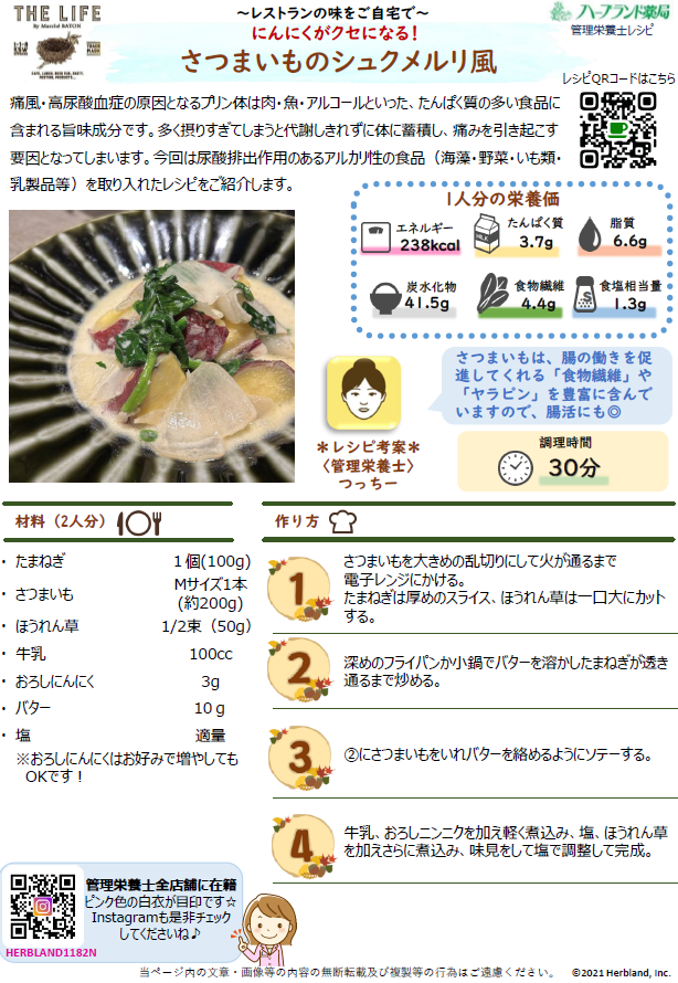 今回は尿酸排出作用のあるアルカリ性の食品(海藻・野菜・いも類・乳製品等)を取り入れたレシピをご紹介します。