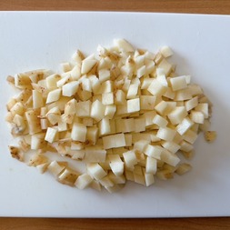 じゃがいもと鶏胸肉を1cmの角切りにする。