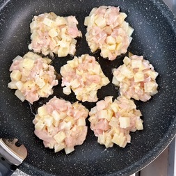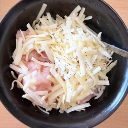 加熱したじゃがいものボウルに①で切った鶏胸肉、片栗粉、塩胡椒、チーズを入れよく混ぜ合わせる。