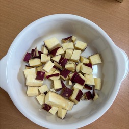 さつまいもを1cm角に切り、レンジで600W2分加熱して、少し火を通しておく。