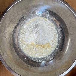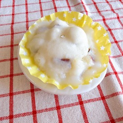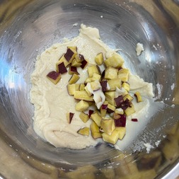 ②に米粉、砂糖を加えて混ぜ、なめらかになったらベーキングパウダーとさつまいもを加えてさらに混ぜる。