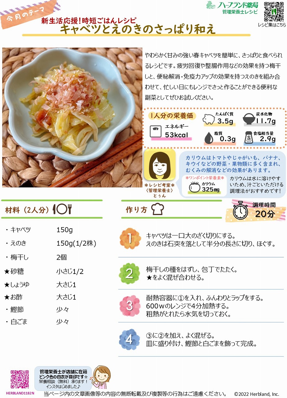 疲労回復や整腸作用などの効果を持つ梅干しと、便秘解消・免疫力アップの効果を持つえのきを組み合わせて、忙しい日にもレンジでさっと作ることができる便利な副菜としてぜひお試しください。