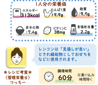 レンコンは皮付きのまま5mm程の厚さの半月切りにする。