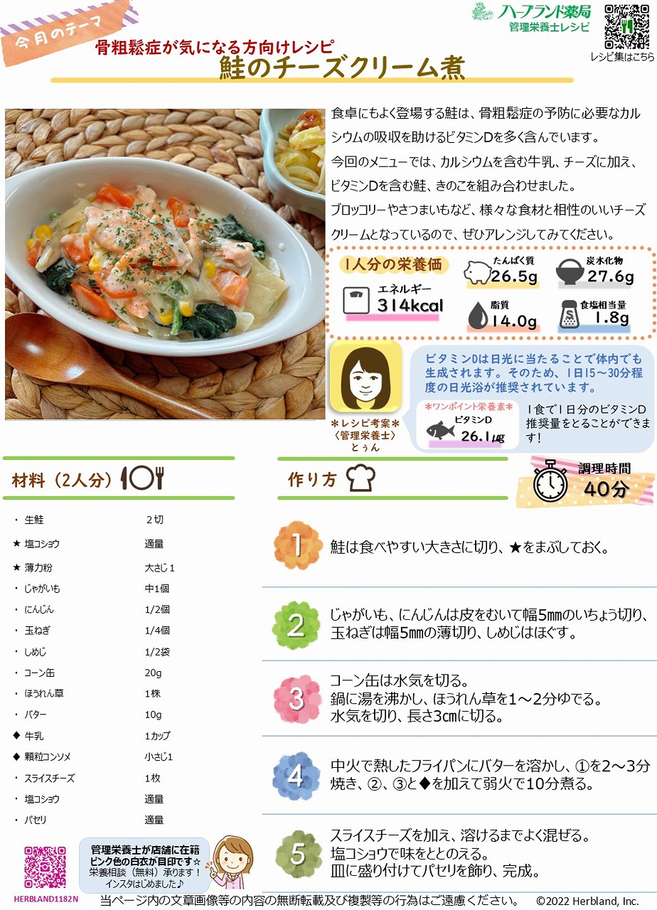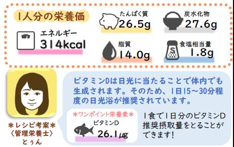 今回のメニューでは、カルシウムを含む牛乳、チーズに加え、ビタミンDを含む鮭、きのこを組み合わせました。